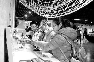图:在中国盲文图书馆触摸博物馆,视障青少年通过触摸感受展品